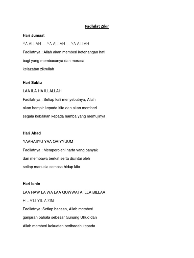 (dibaca 1000 kali atau lebih). Zikir harian isnin hingga ahad, zikir, zikir isnin, zikir hari isnin. Download mp3 zikir hari isnin gratis, ada 20 daftar lagu zikir hari isnin yang bisa anda download. Satu kalimah disebut akan diberikan ganjaran pahala sebesar bukit uhud. Download mp3 zikir hari ahad dan video mp4 gratis.